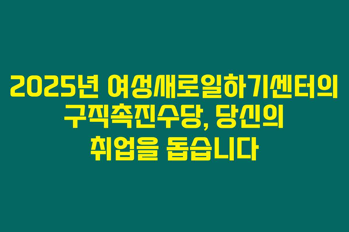 제가 알아본 바로는, 2025년 여성새로일하기센터에서는 경력 단절 여성과 미취업 여성을 위한 구직촉진수당과 다양한 취업 지원 프로그램을 통해 경제적 부담을 덜어주고, 재취업을 지원하고 있습니다. 특히, 구직촉진수당은 구직활동 중인 여성들에게 제공되는 지원금으로, 신청 방법과 조건이 궁금하다면 아래를 읽어보시면 많은 도움이 될 것입니다.