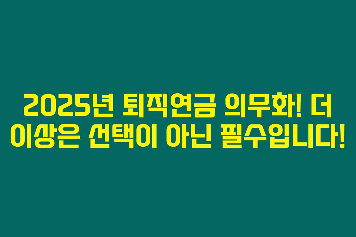 제가 직접 알아본 바로는, 2025년부터 퇴직연금이 의무화된다는 변화가 우리 일터와 노후 준비에 큰 영향을 미치게 될 것이라는 점입니다. 더 이상 퇴직금을 선택할 수 없는 시대가 오고, 모든 사업장이 퇴직연금 제도를 도입해야 할 의무가 주어진다는 사실이죠. 아래를 읽어보시면, 퇴직연금의 중요성과 구성 방식, 아니면 앞으로의 준비 방법에 대해 자세히 설명드릴게요!