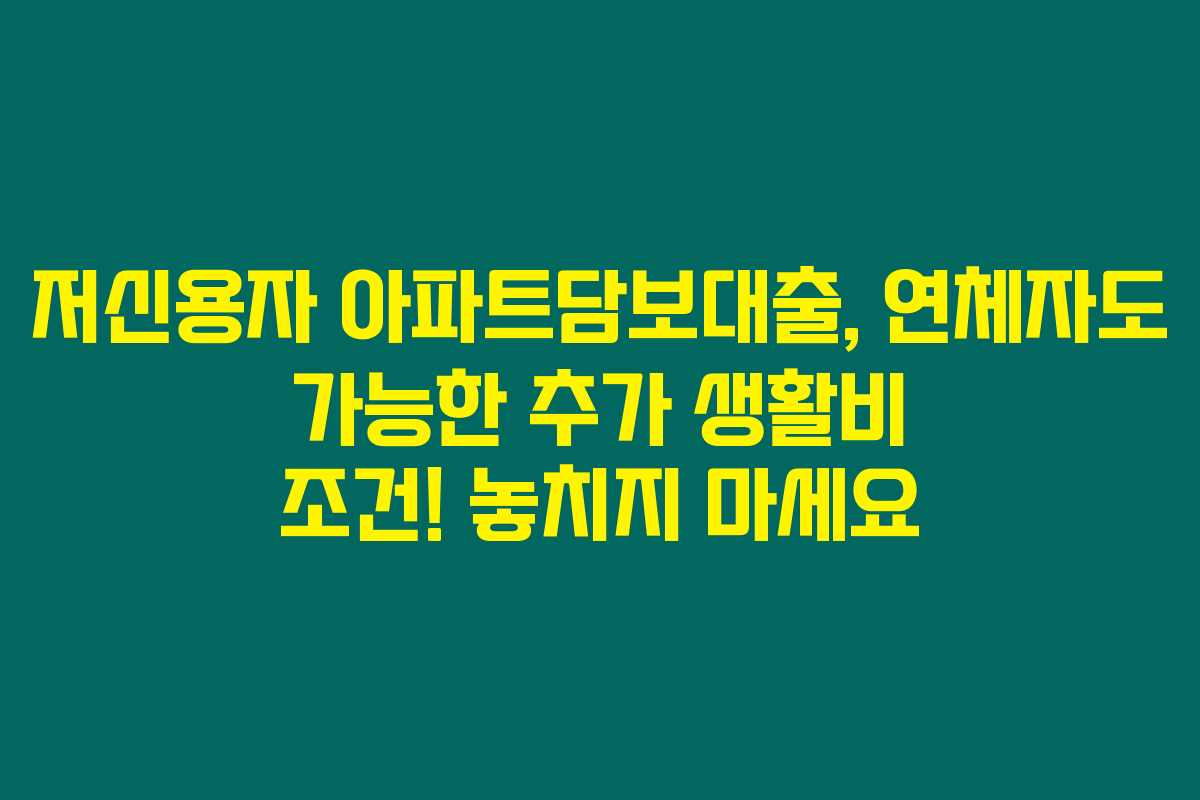 저신용자 아파트담보대출이 연체 이력이 있는 분들에게도 새로운 희망이 될 수 있다는 사실 알고 계셨나요? 만약 아파트담보대출을 받아 추가 생활비를 마련하고 싶은데, 신용도나 연체로 고민하고 계신다면 이 내용은 꼭 확인해보셔야 해요. 아래를 읽어보시면 저신용자 아파트담보대출에 대한 다양한 조건과 정보를 알차게 소개할게요!
